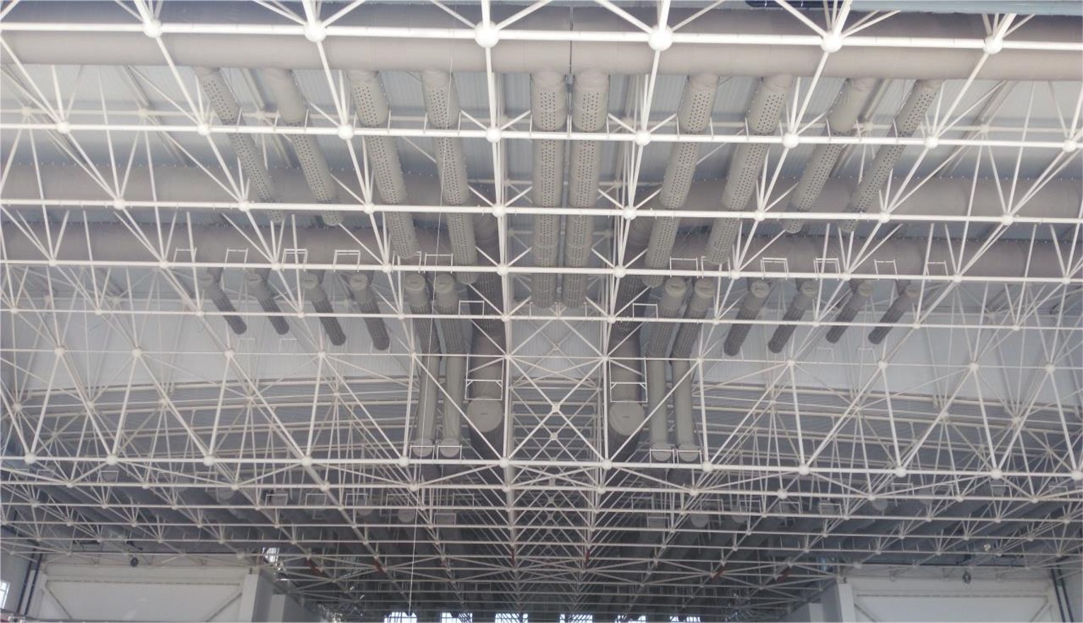 解决方案:设计网架内布置IRR支撑型索斯风管或吊顶下半圆形索斯风管,实现对工作面区域的均匀覆盖送风,据机体高度位置变化精准控制不同射程不同末端风速,形成层流结构式送风,末端风速控制在0.25~0.5m/s;风管沿机体外形布置,最大化风场的有效覆盖,减少能源浪费。