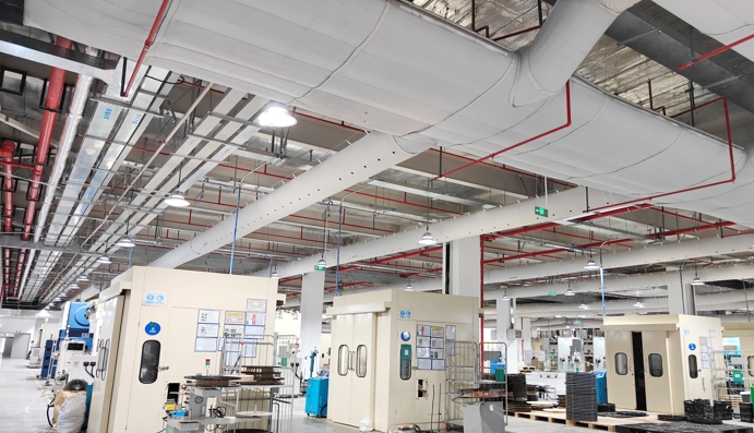 应用优势:在富士康龙华工业园洁净厂房空调风管改造项目采用绝热索斯保温风管。圆形的绝热索斯复合保温风管在吊顶内暗装,通过连接高效过滤风口进行均匀送风。相比传统风管,圆形或扁圆风管减少材料用量30~40%。重量轻且成品到现场进行模块化拼装,安装简便,一个月内完成供货安装,获得了业主的一致肯定。