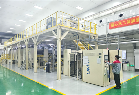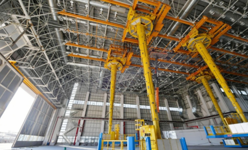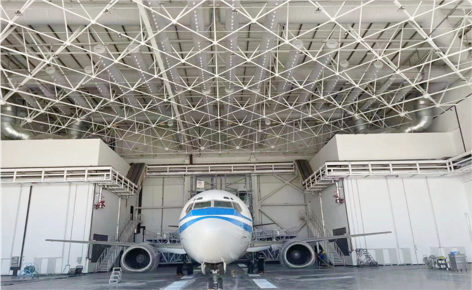 2、出风管利用微孔射流出风方式,根据机体高度位置变化精准控制不同射程相同末端风速,形成结构式送风,末端风速控制在0.25~0.5m/s满足飞机喷涂厂房的送风需求;