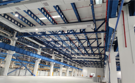 2、受厂房净空要求限制,风管布置在净空高度以上(或沿厂房侧边立柱距地8米),风管均匀布置专用远距离射流喷嘴送风,满足长距离送风覆盖厂房送风区域。