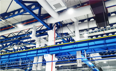 2、出风管利用微孔射流出风方式,根据机体高度位置变化精准控制不同射程相同末端风速,形成结构式送风,末端风速控制在0.25~0.5m/s满足飞机喷涂厂房的送风需求;
