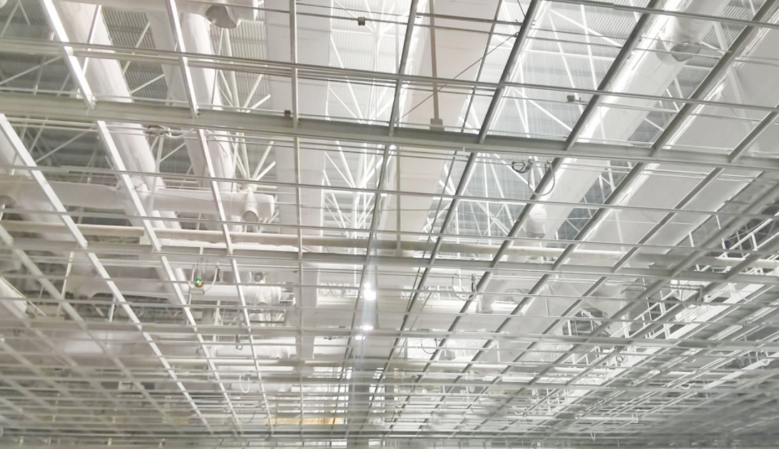 2、受厂房净空要求限制,风管布置在净空高度以上(或沿厂房侧边立柱距地8米),风管均匀布置专用远距离射流喷嘴送风,满足长距离送风覆盖厂房送风区域。