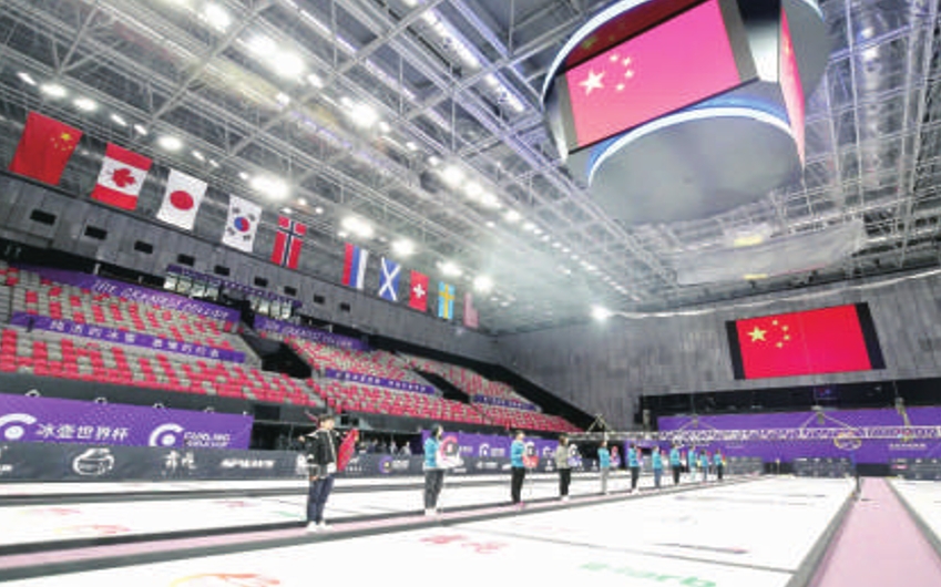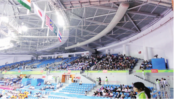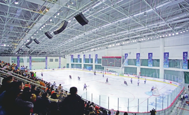 在运动区域:在场地上空马道下环绕场地弧形布置索斯纤维织物风管,4、6点钟方向向内开线型小孔均匀送风,末端风速精控在0.2m/s,对赛场冰面产生均匀扰动除雾。实现赛场送风均匀,节能、重量轻、拆装灵活、易清洁维护的应用优势。